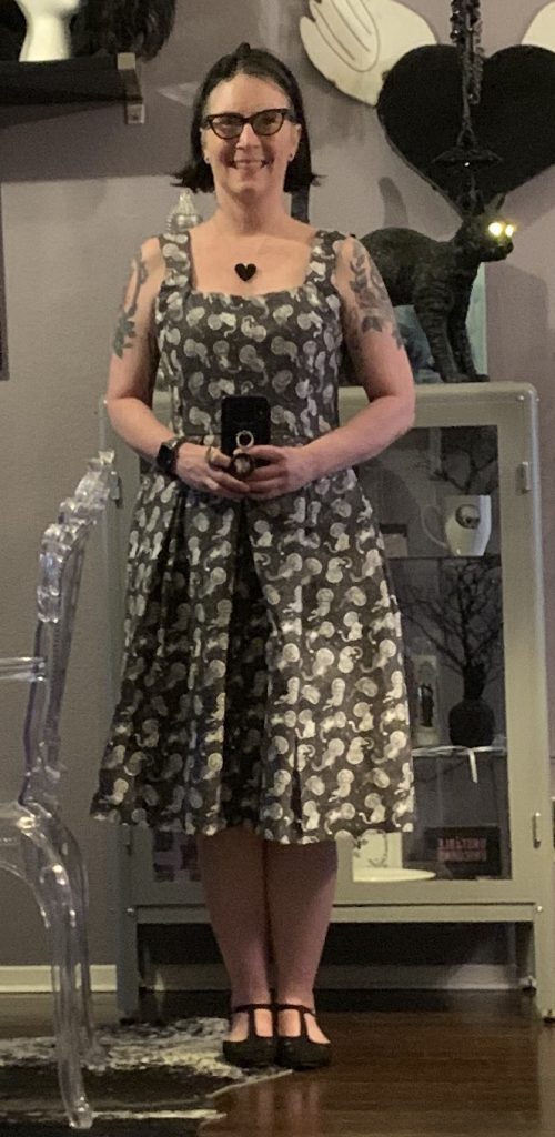 i have NOT been sewing masks. i sew for pleasure. i don't want to sew for purpose. i don't want to have people asking me to make them masks. i had several coworkers text me and ask if i could make them a mask. when i said i wasn't making them, they were perplexed. they asked why, "i mean, you love to sew". and i said that is why. just like my baking, i want it to be a pleasure, not a chore where i have to make other people happy. i have posted a picture on my most recent Gertie's B6556 dress (a 50s Butterick pattern) below. it has space kitties on it. and i am making aprons for christine and i. they have sarcastic patches in the style of Simplicity patterns from the 50s. a pocket has never been so challenging. but i blame to poor instructions. it is an "easy" pattern but i swear they leave words out of the instructions.