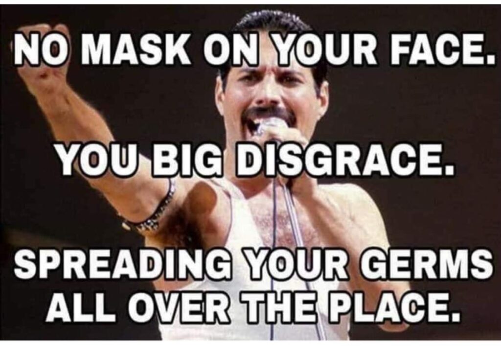when i leave my house for things other than work (aka going to the grocery store or once in a great while joann's for fabric) i dress up. of course, i have always dressed up. but it was always simply habit. i automatically did it. now, i am quite deliberate about it. below is a photo of me in my new hat. and in my outfit for our excursion to the cemetery (susan, christie and i have been twice, susan and i 3 times). and one of my favorite covid mask memes. goodnight.