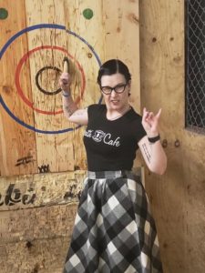 for those of you that don't ever get to see me in person, this is what i look like these days (ax throwing bday party!) (mod cloth skirt, death cafe t-shirt made for my by coworker Jade, black bartoli boot fluevogs (not shown); "Rock me like a Hurricane" - Scorpions)