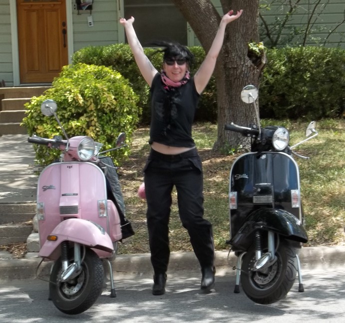 here is my victory photo. i tried to get a more "in the air" shot. but it is harder than it seems. and i was already hot and tired, i didn't want to keep jumping up and down in the air. proud though. i am very proud of what we did. what i was able to do. that was a LOT of miles. and it is such a cute scooter!