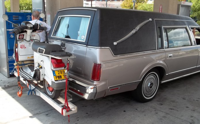here is a photo of the couple i want to be when i grow old. they bought the hearse on eBay. the paris license plate too. they have never been pulled over for it. at the rally, the rode two-up. they wore formal wear to the banquet. his tux even had tails! they are SO cool!