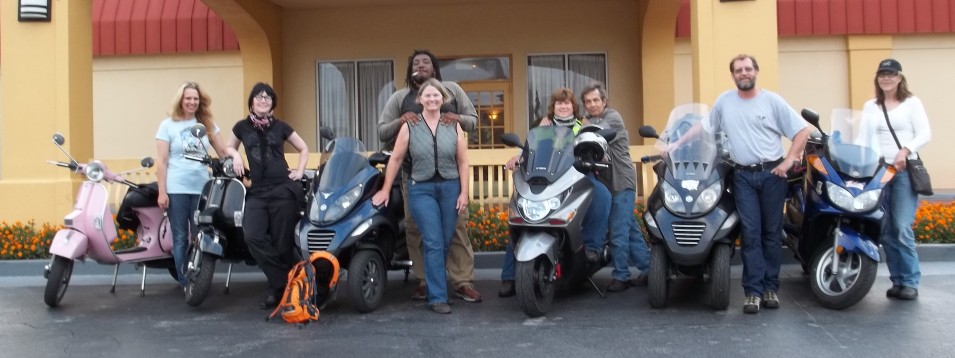 this is my posse. from left to right...christine, our support vehicle driver (very flexible driver!), myself, suellen (rode my bikes), kitteridge (mp3), sue (her bike was the one that burned to the ground...Kymco was super cool though, they gave her a bike to ride home), john hopkins (burgman), mark anderson (mp3 - GPS master!), alice steele (kawasaki and THE coolest 63 year old you have EVER met!)